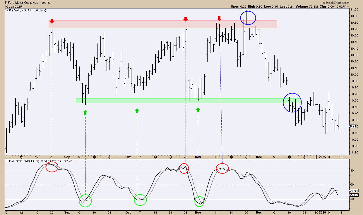 FIGURE 5. DAILY CHART OF FORD. A range scalper might have combined support and resistance ranges with the Stochastic oscillator to go long (green arrow) and short (red arrow) when the stock entered oversold and overbought areas. The blue circles show where price exceeded support and resistance, potentially generating losses.
